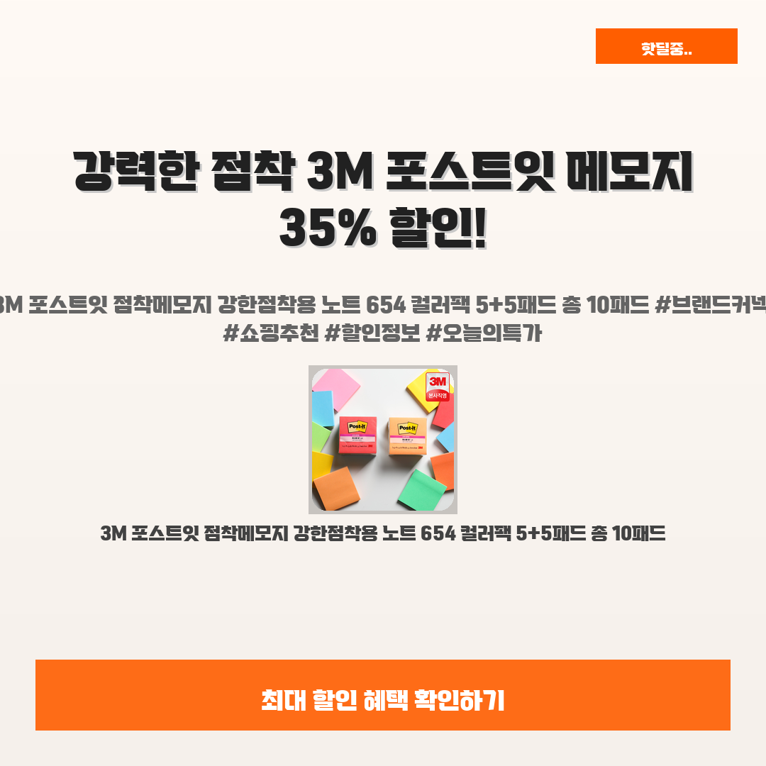🛍️ 이 포스팅은 네이버 쇼핑 커넥트 활동의 일환으로,판매 발생 시 수수료를 제공받습니다.오늘 소개할 제품은 단연코!바로 강력한 점착 3M 포스트잇 점착메모지 강한점착용 노트 654 컬러팩 5+5패드 총 10패드 입니다!일상에서 메모의 필요성을 느끼는 일이 많았던 여러분!저는 늘 중요한 사항이나 아이디어를 적어두곤 했는데, 한 번의 바람에 메모가 날아가는 고통을 겪기도 했어요😭.그런 분들을 위해 등장한 이 메모지가 바로 여러분의 고민을 해결해줄 완벽한 선택입니다!아, 무엇보다도 지금 35% 할인 혜택이 있으니,할인가 13,900원으로 뛰어난 점착력을 경험할 절호의 기회입니다!저도 이 기회를 놓치지 말고 얼른 만나보길 추천드립니다.💪※ 이거 진짜 제가 직접 써보고 쓰는 리뷰예요 광고 아님!!3M 포..